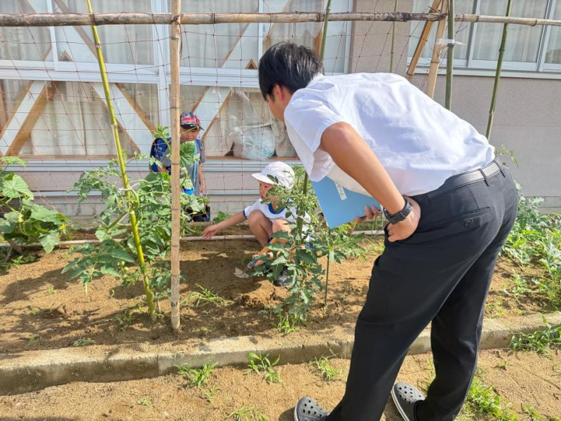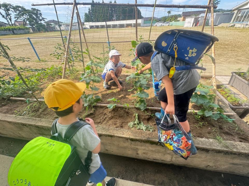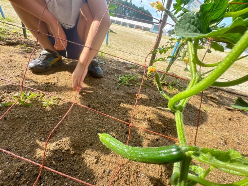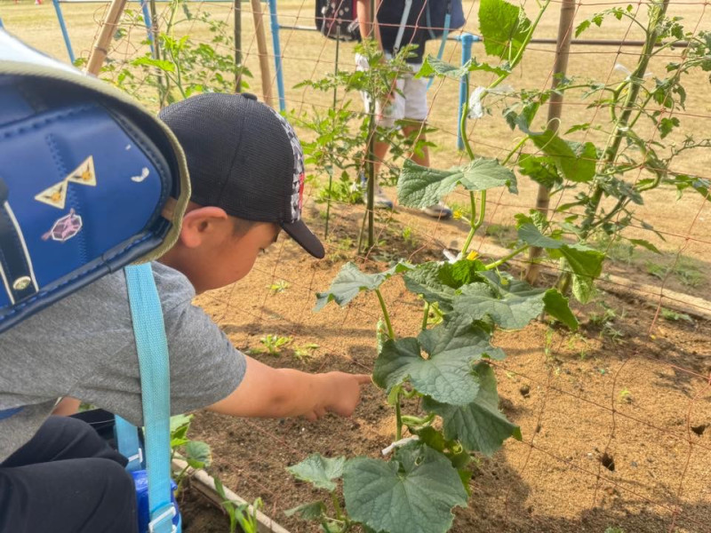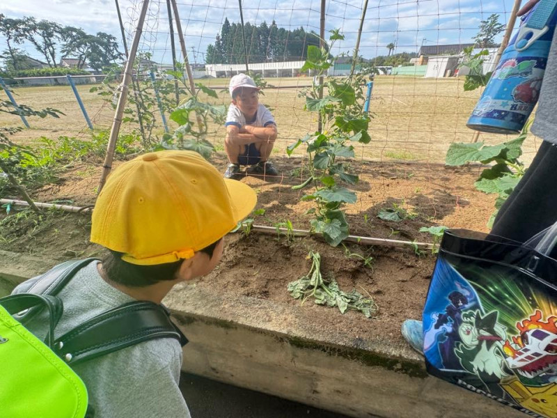 3年生が育てているキュウリを見かけた1年生がいろいろと質問する姿がとても微笑ましい光景です(^^)