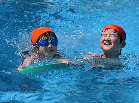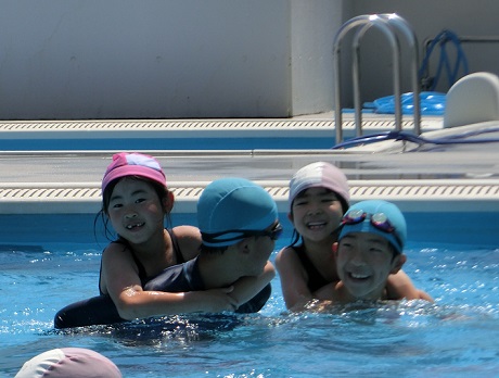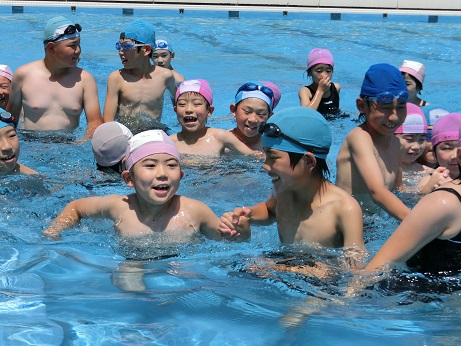 1・2年生は、6年生と一緒に水泳の学習です。初めての小学校のプールに緊張していた1年生も、6年生と一緒で楽しかったようです。