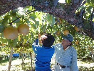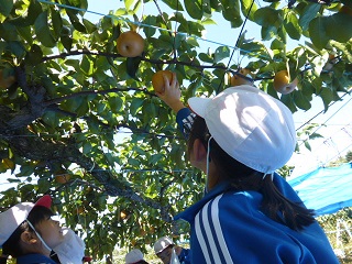 2018年9月19日 15時30分3年生は社会科の「農家のしごと」の学習で、上真野地区にある梨園の見学にいきました。もともと鹿島区は梨農家が多く、子ども達にとって身近な農家です。見学では、梨農家の1年間の仕事内容や苦労などについてお話を聞きました。子ども達も関心が高まり、質問もたくさんでました。さらに、実際に梨の収穫の体験もさせていただきました。子ども達は、梨の木をながめて、「どの梨にしようかなぁ」、「大きい梨をとろう!」と大喜びでした。とても貴重な体験ができました。