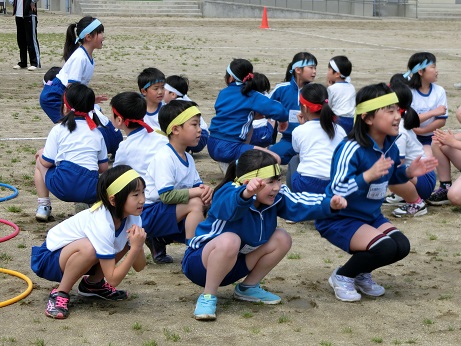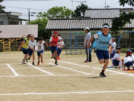 全校リレーの練習です。勝つのはどのチームでしょう。