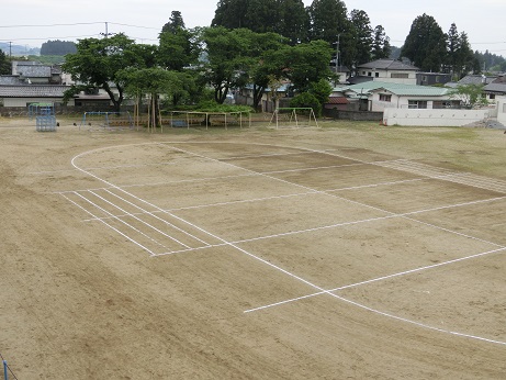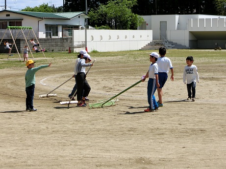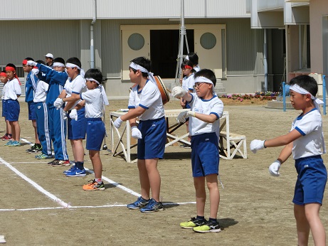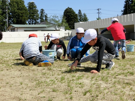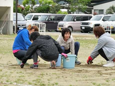 このような全体練習がスムーズにできるのは・・・、毎日昼休みに体育委員会の子ども達がグランドの整地、ライン引きをしてくれているからです。また、体育委員会活動を見て、まだ残っている草の除草作業をお手伝いしてくれる子ども達もたくさんいます。