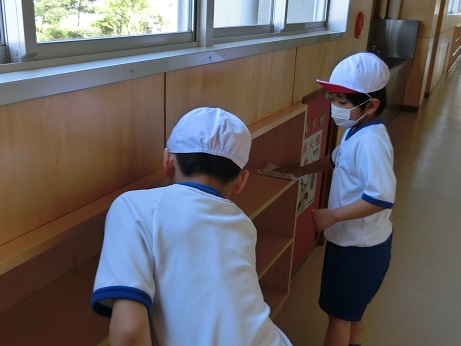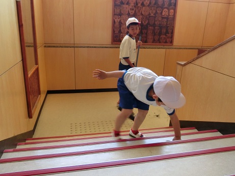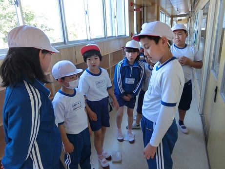 今日から1年生が、たてわり班で行っている一斉清掃に参加です。整列の仕方・清掃の具体的な方法など、6年生が中心になってていねいに教える様子があちこちで見られました。教え方も、1年生の目線に立って、わかりやすい表現を心がけていたようです。清掃後、6年生の班長に「おそうじ上手だね」とほめられたと喜んで教室に帰ってきた子もいました。1年生の自信とやる気につながるような言葉かけができる6年生、さすがです。