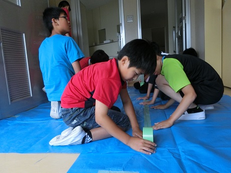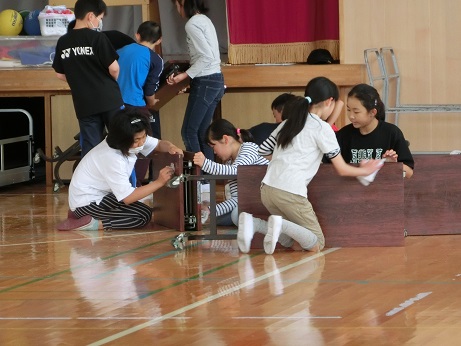 イスや机もひとつひとつていねいにふいています。床のシート貼りでは、「小さい子が転ばないように、しっかり貼らなきゃね」といった声も聞こえてきました。来場されるたくさんの方々と一緒に、運動会を成功させたいという思いが伝わってきました。