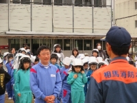 校庭では校長先生と消防署の方からお話をいただきました。校長先生からは,階段の歩き方がきちんとできていたということと,ハンカチを忘れてしまっても袖などで煙を防ぐ工夫をしていたということを話していただきました。消防署の方からは,放送や先生の話を聞くことの大切さや煙のスピードについて教えていただきました。秒速30~80cmもあるので逃げきれないのでハンカチはとても大切だということです。また,家庭用の火災報知器の電池切れなども日頃から点検しておく必要があるとのことでした。