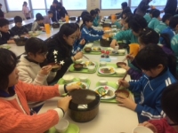 5・6年生の宿泊活動中のお弁当の日に、1・2年生いっしょにお弁当を食べました。1年生が2年生教室に移動。座るシートは2年生が準備してくれました。いつもと違った風景に、話も弾む子どもたち。その中の一番の話題は、保護者の皆様が思いを込めてつくってくれたお弁当のことでした。「朝早く起きてつくってくれたんだ。」、「好きなものばかり入れてくれたんだよ。」、「待ちきれないよ、早く食べよう。おなかがすいた!」などなど。保護者のみなさんの思いの詰まったお弁当に、みんな満足満足でした。お忙しい中、いつもおいしいお弁当を、ありがとうございます!