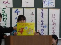 図書委員会からは紙芝居『おにとおひゃくしょうさん』を通して,どうして節分には豆をまくのかということを教えてもらいました。続いて,各学級の代表2名による退治したい心の鬼の発表を行いました。「夜更かし鬼」や「恥ずかしがりや鬼」,「泣き虫鬼」など普段の自分の姿をよく見つめたうえでの退治したい鬼になっていました。ぜひとも豆の力で追い出してほしいですね。