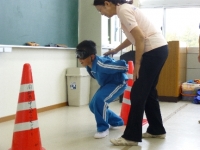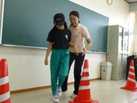 つぎに,車いす体験や視野を狭くして活動する体験,足に重りをつけて歩く体験,左半身が動かなくなる体験などを行いました。