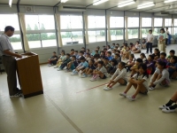 の3つの約束です。また、各学年から一名がみんなの前で目標を発表しました。教室にはみんなの水泳学習の目標が掲示してありますが、どれも気合が入っています。みんなそれぞれの目標にむかって頑張ってほしいです。約束を守って安全で楽しい水泳学習にしたいですね。