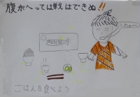 「腹がへっては戦はできぬ」・・・これは保健給食委員会の児童が朝食の大切さのポスターを描いた際のキャッチフレーズです。よく聞くことわざと思いますが、毎日学校で学習したり活動したりする子ども達にとっても、大切なことなのです。朝ごはんは、1日を元気にスタートするエネルギー源です。また、1日を元気にすごすためだけでなく、体と心の成長も支えています。「食」は「人」に「良」と書きますが、食事は人を良くする貴重な機会でもあるのです。朝食を食べてより良く元気に学校生活をおくれたらと思います。