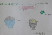 先日の「朝食見直そう週間」での朝食摂取率は100%でした。朝のお忙しい時間にご協力いただきありがとうございました。朝食見直そう週間に取り組む中で、自分の食習慣をふりかえり、課題をみつけて解決のためにがんばる姿も見られました。