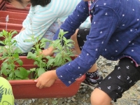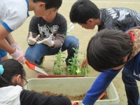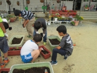 2015年5月28日 12時49分 本日は第1回緑化活動ということで,一人一鉢とプランターへの花の苗の移植をしました。