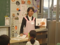 給食を一緒に食べるだけでなく、食材として使われていた「かぼちゃ」の栄養や野菜のはたらきについて教えてくれました。また、かぼちゃにちなんでハロウィンのお話など食文化の話も聞かせてもらいました。今回は、3年生としか触れ合う時間はありませんでしたが、他の学年からも「きてほしかったなぁ」という声も聞こえてきました。