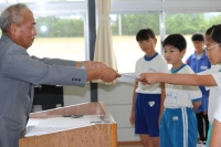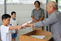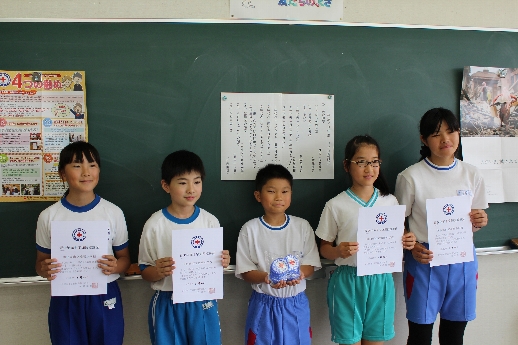 続いて誓いの言葉です。これは各学年の代表児童に続いて,全員が大きな声でJRCの誓いの言葉を言いました。みんな神妙な面持ちで真剣に言葉を唱えていました。そしていよいよ各校ごとに校長先生から参加証とワッペンをいただきました。また,福島県の支部長が内堀知事さんということにも驚いていました。
