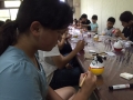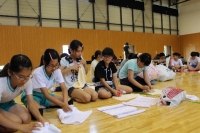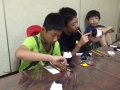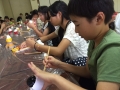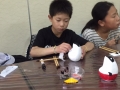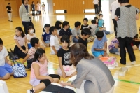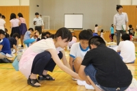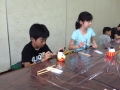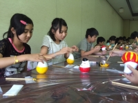 南相馬市博物館の二上さんの話によりますと,この火の祭りや火の玉はおよそ130年前に始まったそうです。初めは村人がたいまつを持って出迎えていたのですが,さらに明るくしようということで,火の玉を飾るようになりました。当初の火の玉はホッキ貝の貝殻に油を入れたものを使っていましたが,現在はろうそくを仕込んだ布を使っています。今回はその火の玉を1~6年生までで作りました。
