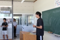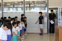 体育主任の小柳先生からは,①具合が悪いときには先生に知らせる。②水泳の決まりをしっかり守る。③プールを貸してくださっている上真野小学校に感謝の気持ちを持つ。の3つの注意がありました。