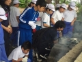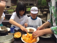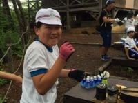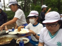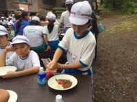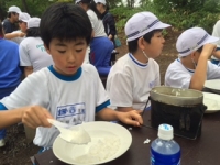 自分たちで手に入れた大切な火を使って、飯ごう炊飯、カレー作りです。薪の火で火加減を調節するのは、なかなか大変なようでした。煙にも苦労しながらも、おこげ入りご飯、カレーを完成させることができました。全員で協力して作ったカレーは、とてもおいしそうです。