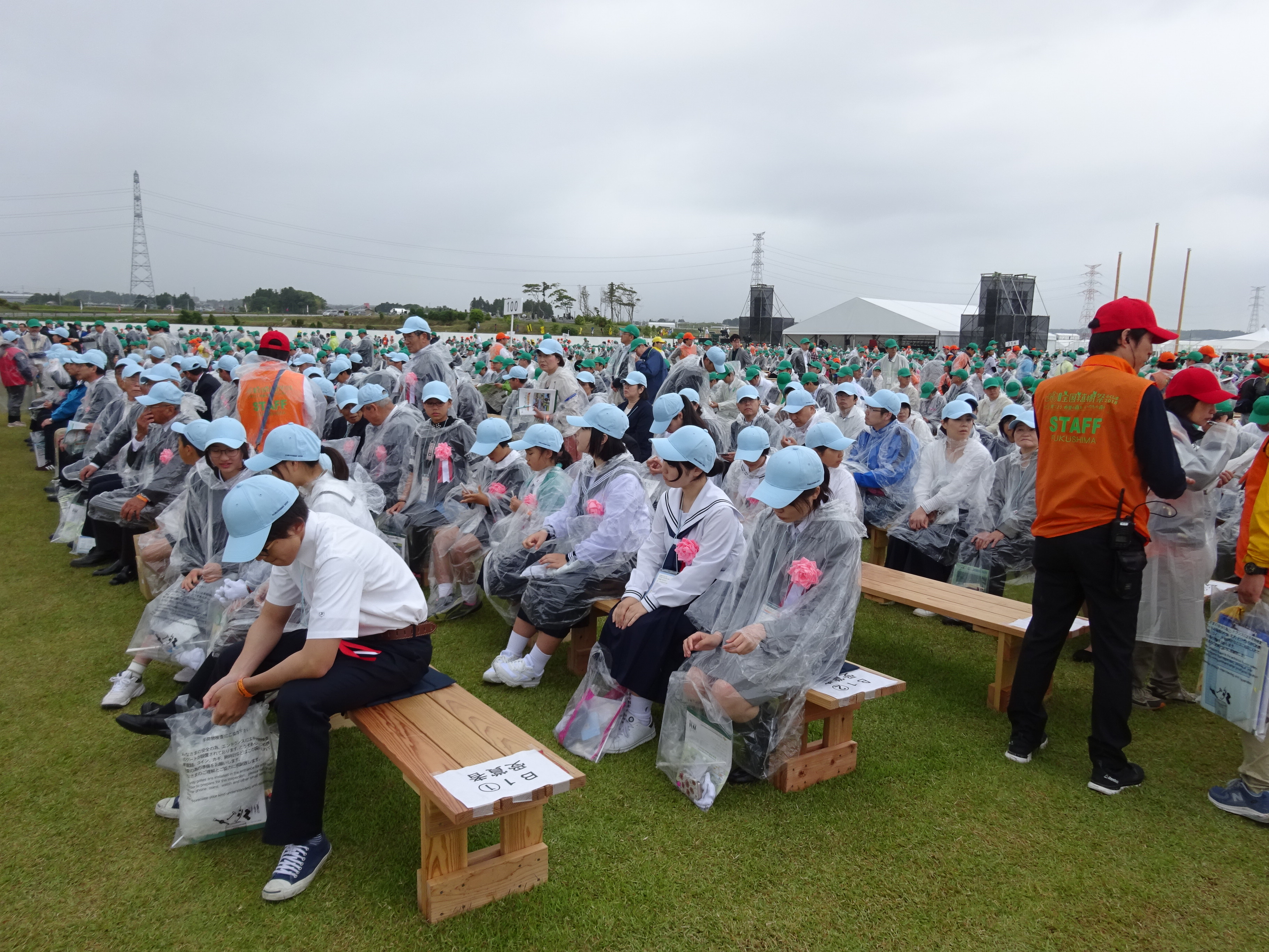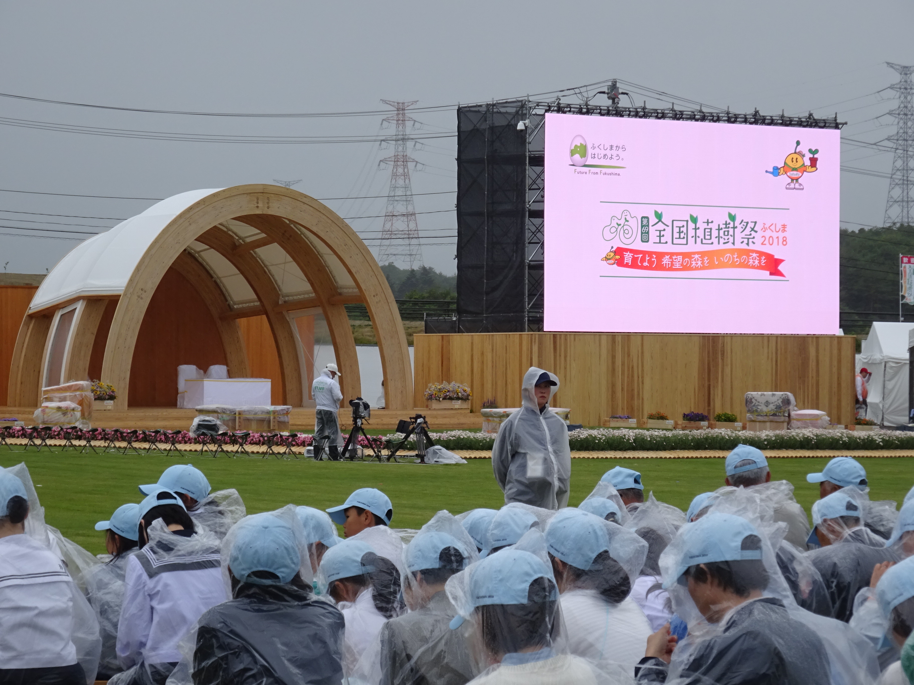 雨が降ったりやんだりのあいにくの天気の中、植樹祭の開会を待つ会場の皆さんの様子です。
