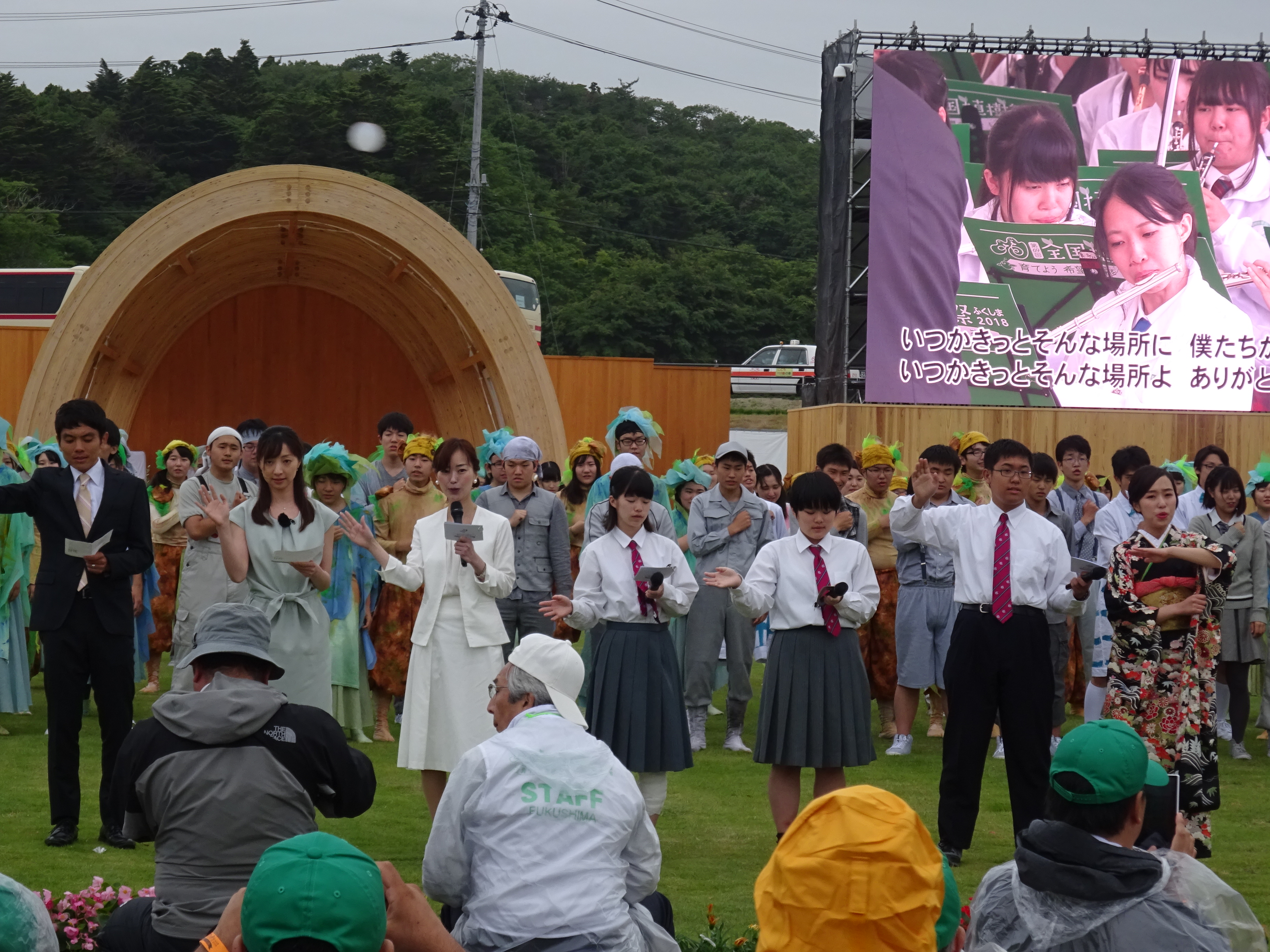 ランドフィナーレには、この式典に出演された皆さんで、大会テーマソング「福ある島」(作詞・作曲Greeeen)を大合唱してしめくくりました。