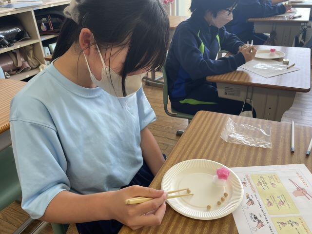 正しい箸の持ち方で、スポンジや豆をつまむ体験をしました。とても器用です。