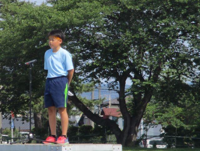 開会宣言。代表として堂々と誓いの言葉を述べるたくましい姿に、仲間として誇りを感じている子どもたちでした。