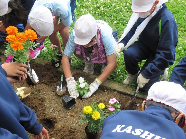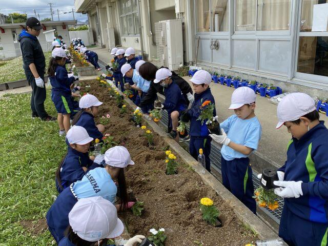 今日は、2・4・6年生が夏の花苗を植えました。