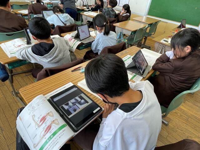 「腕が曲がる時は筋肉がどのようになっているのかな」等を、動画や教科書で調べていました。