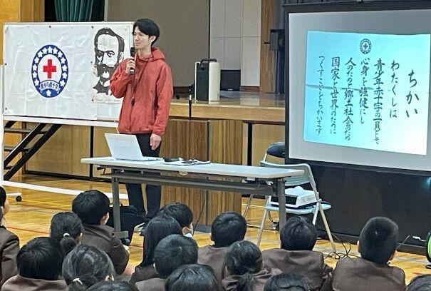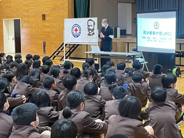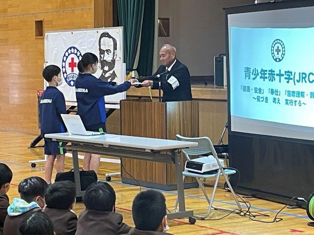 この会は、子どもたちが赤十字の精神に基づき、世界の平和と福祉に貢献できる実践力を高めることをねらいとして行っています。全校児童が加盟していますが、4~6年生が代表して加盟会に臨みました。