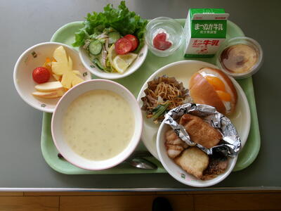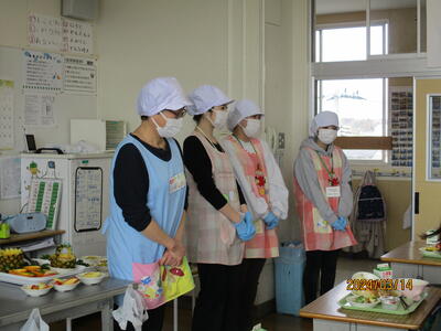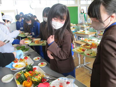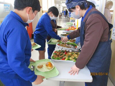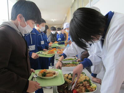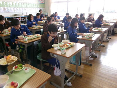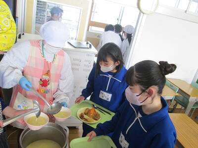 6年生にとって小学校最後の給食は、恒例の「卒業お楽しみ給食」でした。いつもよりおかずの数も多く、おかわりも自由です。4校時途中から、給食センターの方たちが準備を始めると、教室までおいしそうな匂いがしてきました。授業が終わると給食当番も一緒に配膳を手伝いました。おいしそうな主食やおかず、デザートが盛りだくさんです。こんなにたくさん食べられるのかと思いましたが、ほとんどが完食! 思い出に残る、楽しい給食になりました。給食センターの皆さん、素敵な卒業のお祝いをありがとうございました。これまで、おいしい給食を作っていただいたおかげで、みんな大きく成長しました。感謝の気持ちを忘れずに、立派な中学生になってください。