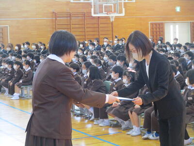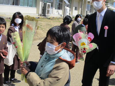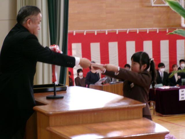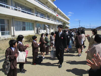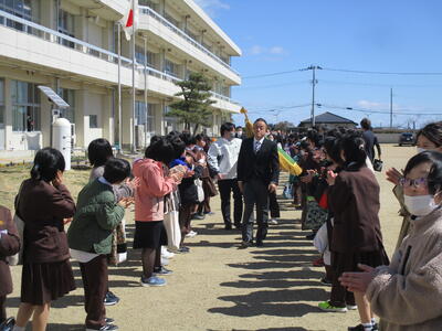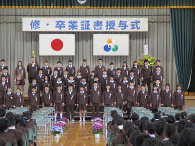 コロナ後、久しぶりに全校生が揃い、修・卒業証書授与式を行いました。1時間10分という長い時間でしたが、低学年の子どもたちも、良い姿勢で話を聞いたり、卒業証書を受け取る卒業生の様子を見たりと、しっかりとした態度で参加していました。卒業生は、少し緊張しながらも、落ち着いて式に臨んでいました。お世話になった家族に感謝の気持ちを伝えながら卒業証書を手渡す姿に、6年間の成長を感じました。式の後、51名の卒業生は全校生に見送られ、晴れやかな笑顔で母校を巣立っていきました。中学校でも、自分の力を大いに発揮して頑張ってください。ご臨席いただきましたご来賓の皆様、本日は、ありがとうございました。これまでのご支援・ご協力に感謝いたします。