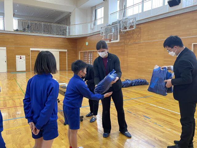 新しい運動着の贈呈も行われ、明日以降、全児童の手元に届きます。