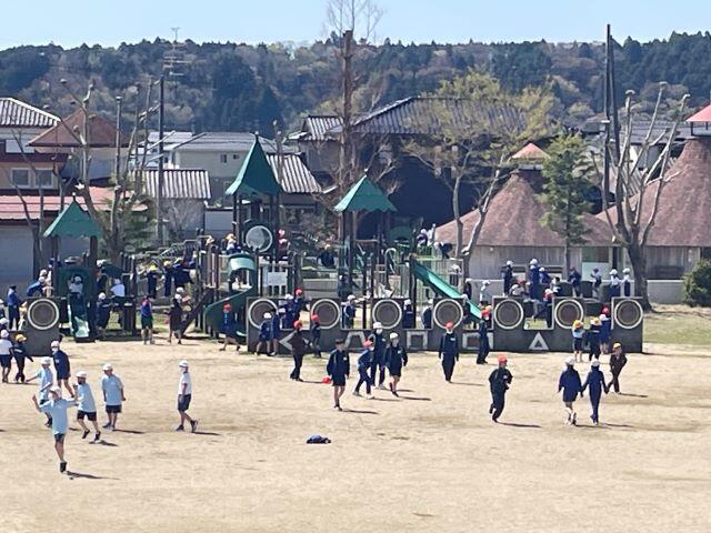 休み時間の終わりのチャイムが鳴ると、一斉に校舎にもどる「かしまっ子」たち。