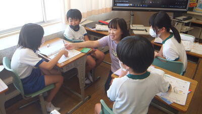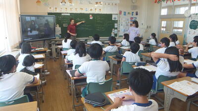 今日の5年生の外国語科の授業は、八沢小学校の5年生と一緒に行いました。いつもは広い外国語ルームが、鹿島小と八沢小の5年生が一緒に集まると、何だか狭く感じます。今日は、身近な人や知っている人の「できること」を紹介する学習でした。ALTの説明を聞いた後、グループごとに分かれて自分が引いたカードに書かれている人について友達に伝えました。これまでにも八沢小とは、交流学習で一緒に取り組んだことがあるので、お互いに楽しく交流することができました。次の交流学習が楽しみですね。