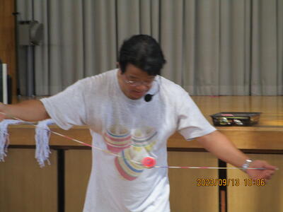 前半は、安藤先生が様々な独楽を使った高度な技をたくさん披露してくださいました。今までに見たこともない技を間近で見た子どもたちからは、大きな歓声が上がりました。