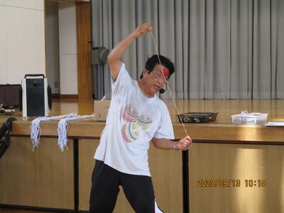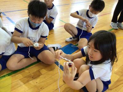 後半は、子どもたちが実際に独楽回しに挑戦しました。安藤先生から回し方のコツを教えてもらいながら、一所懸命に挑戦していました。なかなか上手く回せない子どもたちには、安藤先生から「何度も練習すると上達するよ! 頑張れ!」と励ましの言葉をかけてもらっていました。