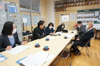 次に、校長室で話し合いを行い、児童や保護者、教職員による「学校評価」について説明するとともに