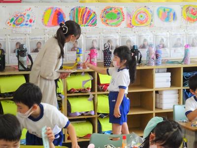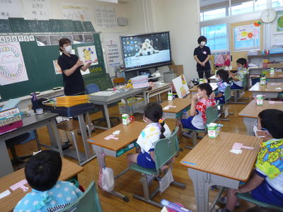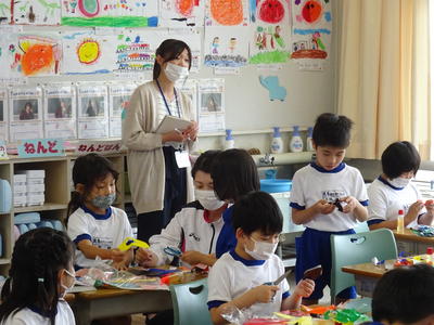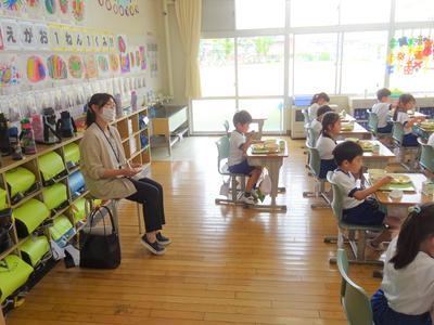 鹿島幼稚園の先生が、1年生の授業や休み時間、給食の様子などを