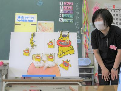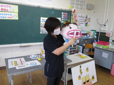 19日(金)に原町保健センターの歯科衛生士の方々をお迎えし、1年生が歯科保健教室を行いました。