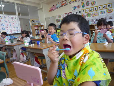 また、お話の後に「赤染め」により磨きづらいところを確認し、歯磨きの仕方を練習しました。
