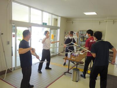 練習しました。男の先生方は、“さすまた”を持ち、不審者を教室に近づけないような