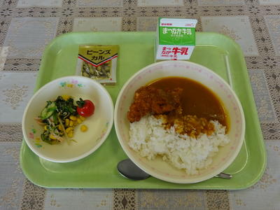 今日の献立は、カツカレー、ポパイサラダ、ミニトマト、ビーンズカル、牛乳でした。
