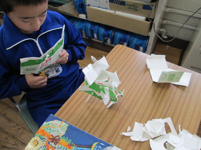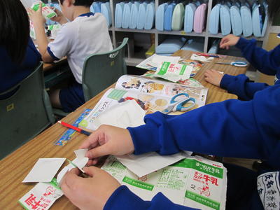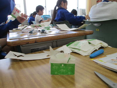 牛乳パックなどの材料を使って作品づくりを進める3年生の図工「クミクミックス」。