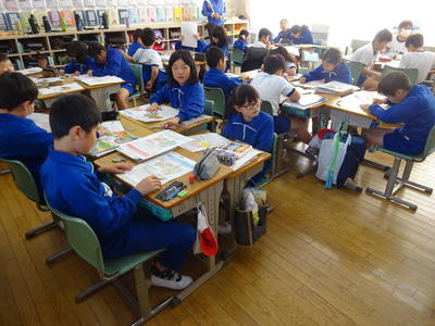 「図書室での過ごし方」や「借りた本は最後まで読もう」「図書室ガイド(ジャンル別の本の位置案内)」など、全校の児童のみなさんに呼びかけるポスター作りに熱心に取り組んでいました。
