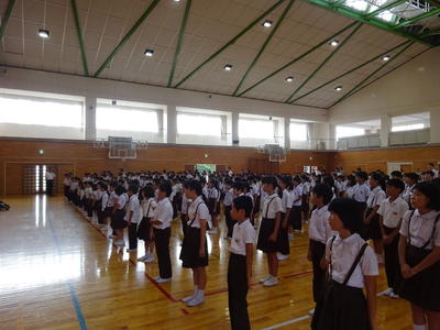 始業式では、校長先生から、2学期には大きな行事や様々な作品展等があるので、自分の得意な分野を見つけて頑張ってほしいということや、健康や安全には十分注意して、みんな元気に仲良く学校生活を送ってほしいというお話がありました。