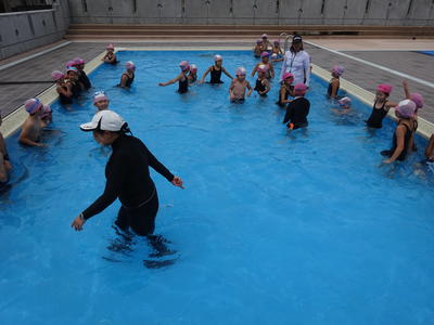 夏休み中のプール開放の際には入水した1年生もいましたが、学年のみんなで授業としてプールに入ったのは、今日が初めてです。