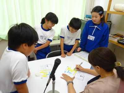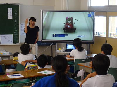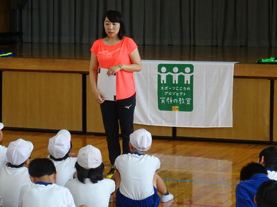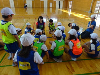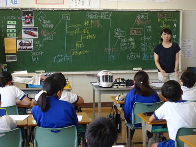 そのうち5年1組では、前半は体育館でゲームなどをして楽しんだ後、後半は教室で桧野さんのお話を聞きました。