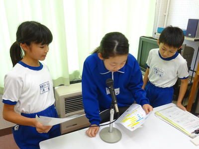 放送委員会の皆さんが、加藤先生やサラ先生の指導を受けながら、日本語と英語を交互に放送し、校内に流しています。