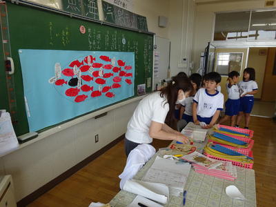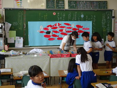 自分たちで作った大きな模造紙の赤い魚たちの目になったスイミーに、思い思いの言葉かけをしていました。