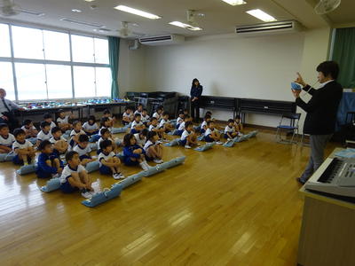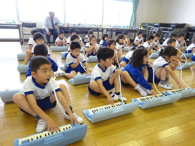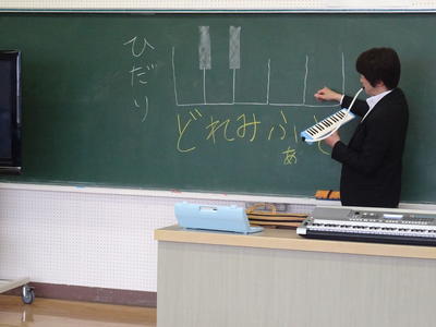 ホルン奏者で吹奏楽の指導などをしてくださる山本先生にお越しいただき、1年生が鍵盤ハーモニカの使い方を教わりました。