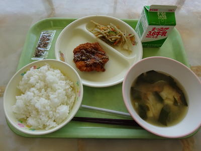 ご飯、仙台麩のみそ汁、ヒレカツ、かみかみサラダ、梅じそふりかけ、牛乳が出ました。