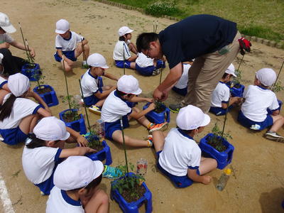 田部さんと門馬さんに教えていただきながら、ミニトマトやナス、かぼちゃ、おくら、さつまいもなどの苗を植えました。